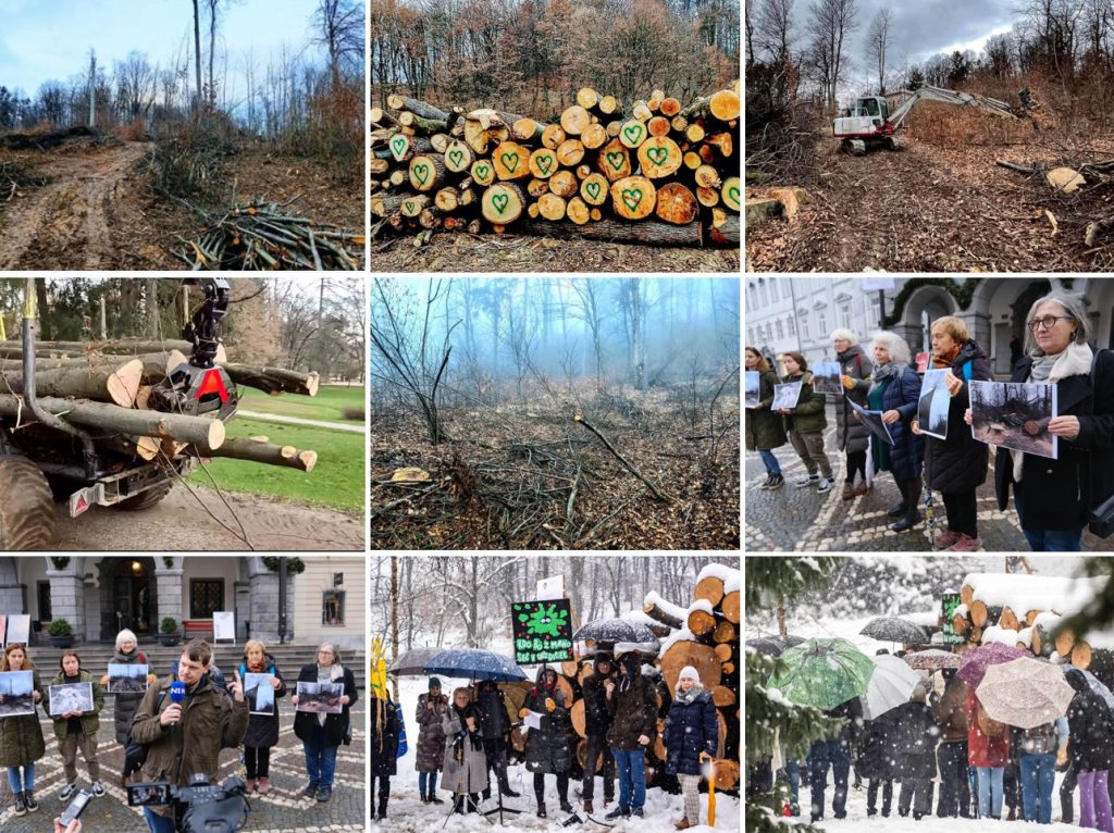 Spodbujeni s strokovno držo osrednje državne naravovarstvene institucije smo se v torek, 17. januarja 2023, zbrali na simboličnem protestu pod Rožnikom in dodatno osvetlili legitimne strokovne vidike urejanja mestnega gozda: vidik varstva narave (Rudi Kraševec, biolog in ekolog in Maja Simoneti, krajinska arhitektka in urbanistka), vidik podnebnih sprememb (Primož Ribarič, meteorolog) in vidik pravic prebivalcev, da so pravočasno obveščeni o posegih v svoje okolje ter tudi da se odzivajo na stanje in sodelujejo pri njegovem urejanju (dr. Maja Simoneti in Sanja Fidler, komunikologinja in redna obiskovalka). Med drugim smo opozorili na vlogo gozda v procesih obnavljanja narave, ki zaradi pomena narave v soočenju človeštva s podnebnimi spremembami postajajo skupna naloga držav članic EU in globalne skupnosti. Na dogodku smo tudi ponovili naše tri zahteve, naslovljene na Mestno občino Ljubljana kot lastnico gozda, naročnico poseka in ustanoviteljico Krajinskega parka Tivoli, Rožnik in Šišenski hrib: